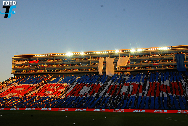 El espectacular telón tricolor en homenaje a Abdón Porte en la Tribuna Atilio García.