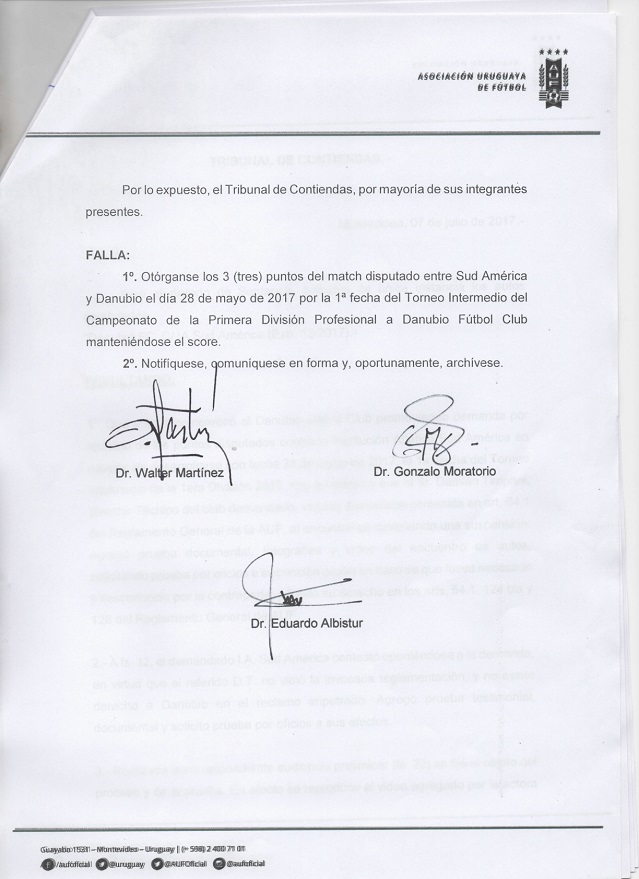 El Tribunal de Contiendas hizo lugar al reclamo de puntos de Danubio sobre Sud América tras considerar que la prueba presentada es contundente, dejando en evidencia al entrenador buzón Damián Timpani quien violó la reglamentación, primero al ingresar a vestuarios, y luego al dar indicaciones a sus dirigidos desde la tribuna, actos que tenía vedado realizar debido a que estaba suspendido.