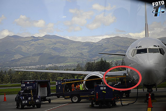 La imágen exclusiva de tenfield.com muestra el avión de “Chilejet” en la pista del aeropuerto Mariscal Sucre de Quito. Debajo del ala, al costado derecho del motor, se encuentran las dos puertas grandes de los depósitos de equipajes. Justamente, en las dos están colocadas las rampas para bajar los bultos de los pasajeros. La zona descrita está marcada en círculo rojo. Una de esas dos puertas quedó mal cerrada, originando el retorno a Guayaquil. El personal del aeropuerto que realiza las tareas de infraestructura aeroportuaria, incluido el cierre de esas puertas, es ecuatoriano.