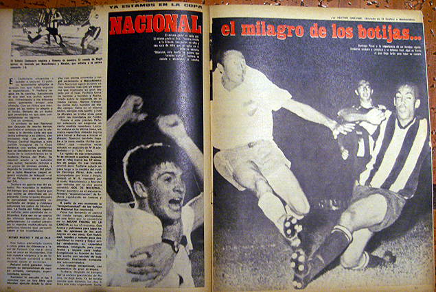 "El Gráfico" de aquel tiempo y el título que lo dice todo: "El milagro de los botijas". Techera grita el triunfo y en la foto grande Luis Varela no logra impedir el gol de Domingo Pérez. En el detalle de la izquierda, "Cascarilla" Morales abre el tanteador.