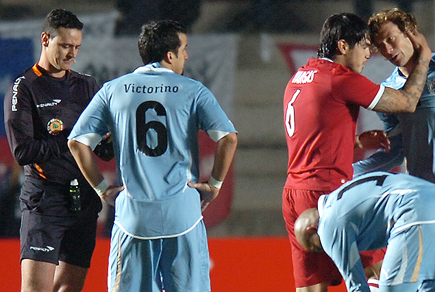 El único partido que Roldán le arbitró a Uruguay. Empate con Perú en la Copa América 2011. Allí se lo ve anotando algo delante de Godín mientras un peruano consuela a Lugano.