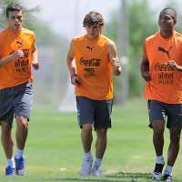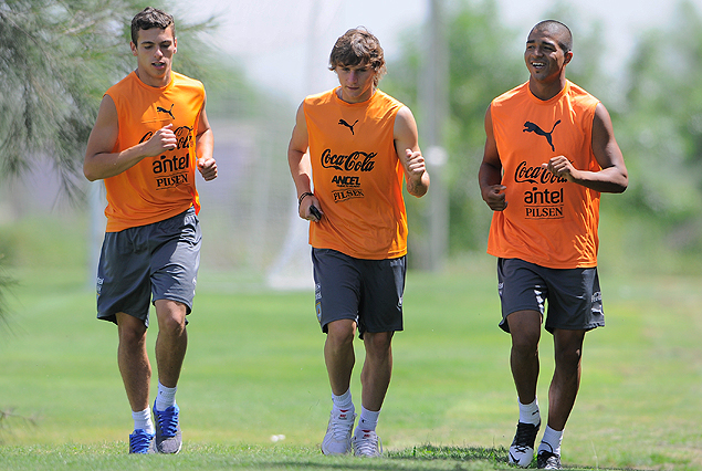 Gonzalo Bueno, Guillermo Varela y Rodrigo Aguirre, trotan por los alrededores de la cancha. La selección Sub 20 puso en marcha la etapa final de preparación.