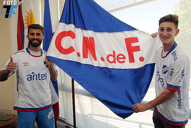 Gino Peruzzi y Facundo Waller con la camiseta tricolor y los dos prendidos a la bandera de Nacional.