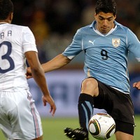 Luis Suárez lleva la pelota mietras Patrick Evra lo sale a marcar. La foto es del Mundial de Sudáfrica 2010.