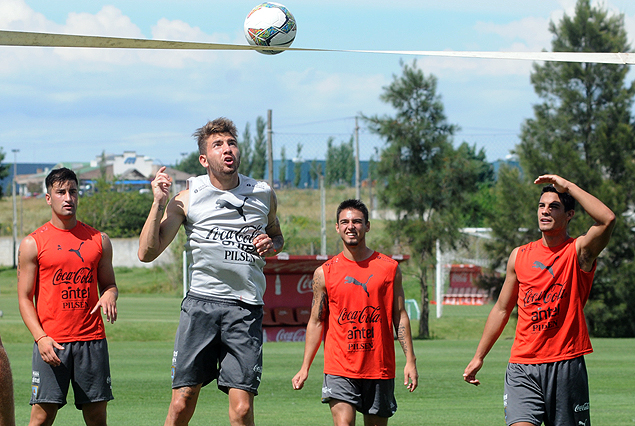 El fútbol tenis de la selección sub 20 desarrollado este martes en el Complejo de la AUF. En la incidencia Enrique Etcheverry salta más alto que todos, mientras sus compañeros observan.