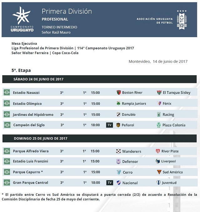 La Mesa Ejecutiva fijó la quinta fecha del Torneo Intermedio que tendrá cuatro partidos el sábado 24 y otros cuatro el domingo 25 de junio.