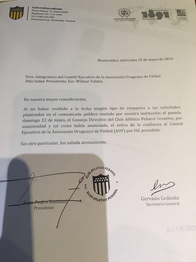 A la hora 17.15 ingresó en la AUF la nota de Peñarol con el retiro de confianza al Consejo Ejecutivo