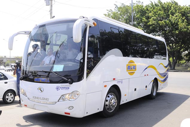El bus que trasladó a Uruguay ingresando al Estadio del Barcelona. Adelante, parado viajaba el Inspector Zuluaga y detrás, en el primer asiento, Tabárez y el Prof. Herrera.