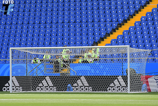 Uno de los arcos del Rostov Arena. Los funcionarios comienzan con sus tareas en las tribunas.