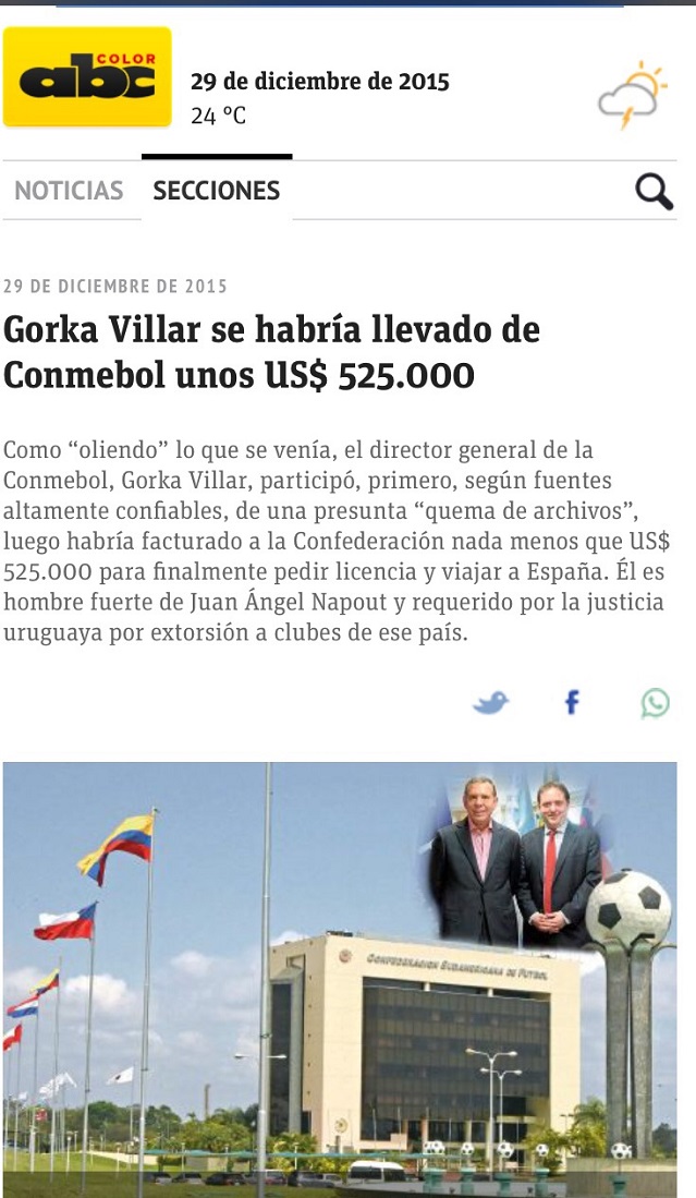 “Como ‘oliendo’ lo que se venía”… Así arranca la publicación de Marco Velázquez, del diario ABC Color de Asunción, en referencia al viaje a España de Gorka Villar, ante la requisitoria de la justicia uruguaya. Villar es director general de la Conmebol, e hijo de Ángel María Villar Llona, presidente de la Real Federación Española de Fútbol y uno de los vicepresidentes de FIFA. Wilmar Valdez tendrá trabajo adicional cuando regrese de Nueva York a donde viajo de vacaciones junto a su familia.