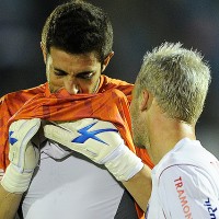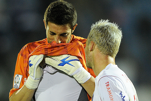Jorge Bava e Israel Damonte se lamentan por la eliminación de la Copa en el Centenario.