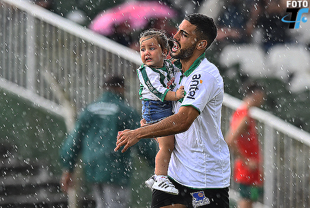 PAPÁ ALVITE: Gastón Alvite, delantero de Racing, entró a la cancha del Parque Roberto con su hija en brazos. El futbolista en el momento familiar compartido e inolvidable.