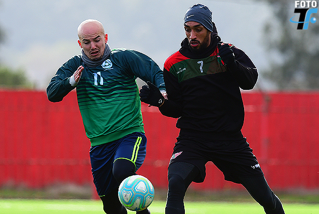 Marcelo Tabárez, delantero de Plaza, y Marcelo Tapia, volante de Boston River, en el Complejo Rentistas.