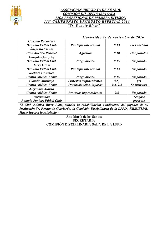 La Comisión Disciplinaria dictó los fallos correspondientes a la duodécima fecha del Campeonato Uruguayo Especial y los que se habían instruido de la etapa anterior. Ángel Rodríguez de Peñarol, fue suspendido por dos partidos por agresión, al tiempo que Gonzalo Rocanieri de Danubio, por puntapié intencional, recibió una pena de tres encuentros de los cuales cumplió uno. A pedido de River Plate, el órgano concedió la rehabilitación condicional para Fernando Gorriarán.