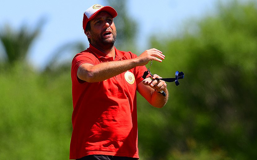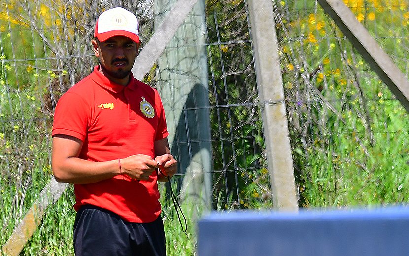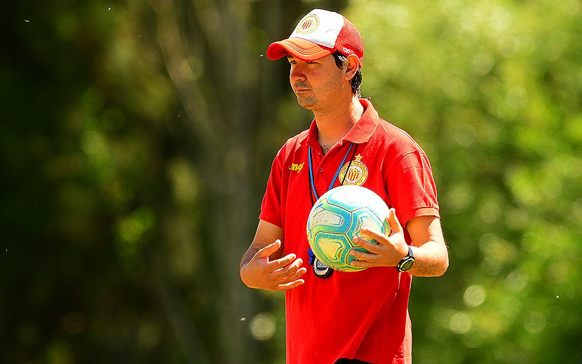 Gastón Añón, nuevo entrenador de Progreso, dirigiendo el entrenamiento en el complejo de la Mutual.