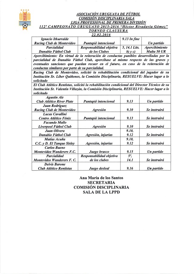 Danubio fue multado con 50 unidades reajustables y apercibido a que las sanciones serán mayores en caso de reiterarse. Liber Quiñones de Racing y Valentín Villazán, entrenador de Rentistas, fueron rehabilitados condicionalmente y podrán actuar a partir de la próxima fecha.