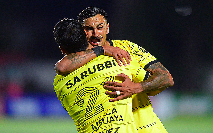 Eduardo Darías, en el eufórico abrazo de gol con Jesús Trindade (número 21). El polifuncional volante-carrilero abrió el camino del triunfo aurinegro en Florida y se convirtió en la figura de la octava etapa del Apertura.