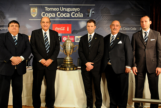 Daniel Barceló, Rafael Fernández, Dr. Juan Ceretta (presidente), Raúl Giuria y Dr. Fernando Costa, integrantes de la Mesa Ejecutiva de Primera división de la AUF, que presidieron la ceremonia de presentación y sorteo del fixture del Campeonato Uruguayo 2014/2015.