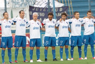 Los jugadores de Nacional formados en el minuto de silencio que se realizó en homenaje a Rogelio Ramírez, ex vicepresidente de la institución.