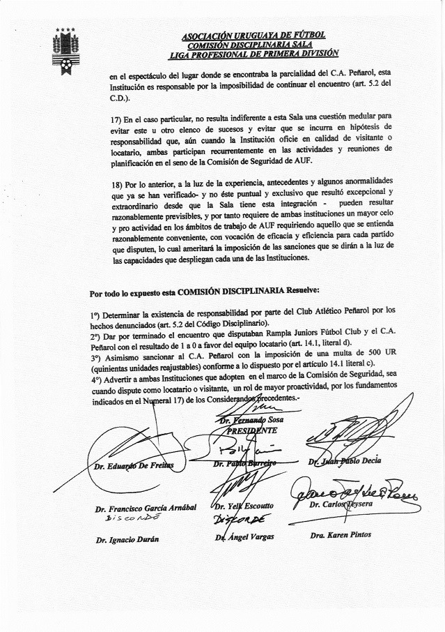 El fallo propiamente dicho, determinó que se dio por terminado el partido entre Rampla Juniors y Peñarol con el triunfo de los picapiedras por 1 a 0. Mañana, la administración de la AUF le adjudicará a Rampla Juniors los tres puntos en la tabla de posiciones.