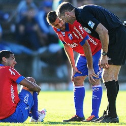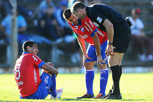 Diego Arismendi dolorido se toma el pie derecho, observado desde cerca por su compañero "Nacho" González y el árbitro Daniel Fedorczuk.