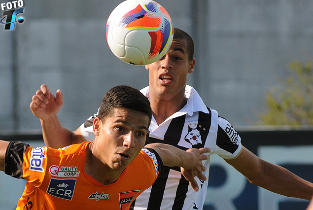 Fernando Arismendi de cabeza al ataque, marcado por Alex Silva.