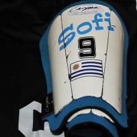 ¡Qué lindo que pase esto con el Mundial a la vuelta de la esquina! Luis Suárez ya tiene pronto en el vestuario, un juego de canilleras en las que se pueden apreciar la inscripción Sofí, en homenaje a su señora esposa, la bandera uruguaya y su clásico número 9.