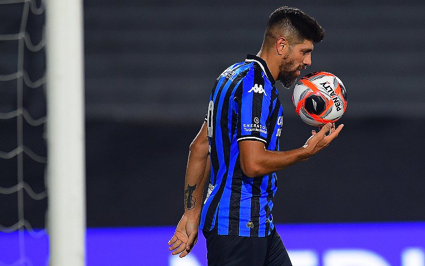 Leandro Díaz, pelota en mano, tras convertir el segundo gol para Atlético Tucumán.