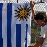 Un hincha uruguayo con vestimenta típica de verano junto a la bandera uruguaya.