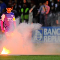 Nicolás Olivera iluminado por una de las bengalas encendidas que cayeron en pleno campo de juego.