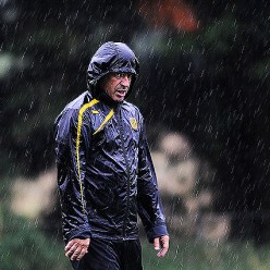 Pablo Bengoechea, encapuchado se cubre de la intensa lluvia, sin perder de vista los movimientos de sus dirigidos este martes en Los Aromos.