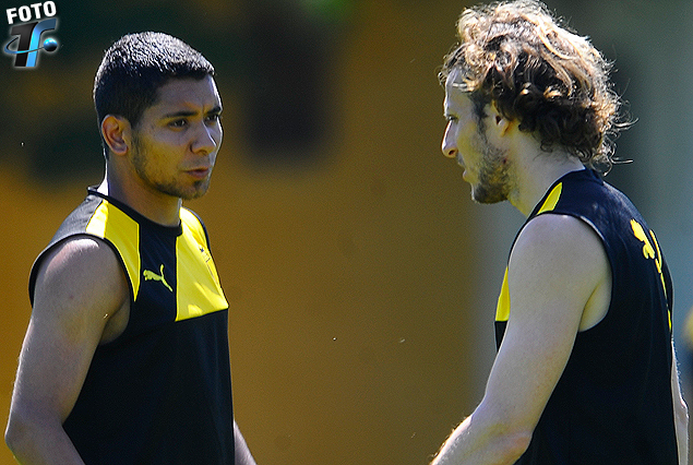 Cristian Palacios en su charla con Diego Forlán. Ambos estuvieron en el ataque en la práctica del miércoles.