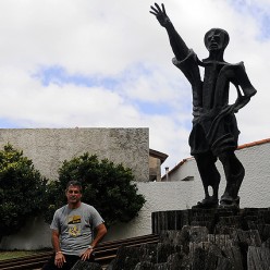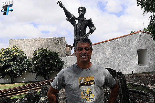 Pablo Bengoechea posa por delante y por primera vez del monumento que lo recuerda como el héroe del segundo quinquenio aurinegro.