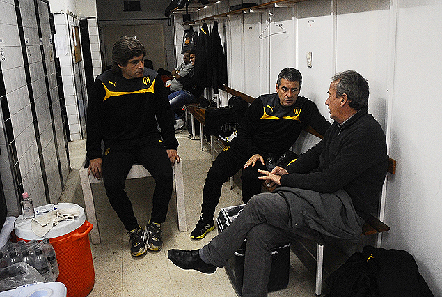 Pablo Bengoechea, el técnico de Peñarol, en el vestuario del Parque Viera, la cancha donde brilló con la camiseta del “bohemio. En la charla con Juan Ahuntchain (gerente de fútbol) y Oscar Ferro (entrenador de arqueros). El equipo salió al campo a los ejercicios de calentamiento.