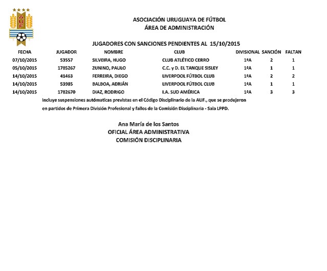 El área administrativa de la AUF confeccionó el boletín de sanciones pendientes que llega a cada una de las instituciones de Primera División previo a la disputa de cada fecha. El jugador que está en la nómina no podrá actuar en la etapa, so pena de que si lo hace, su club pierda los puntos.
