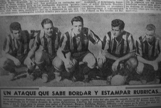 La delantera de Peñarol de 1954 donde Borges fue reubicado por Juan López en la punta derecha, pasando Abbadie como No. 10 Completaban la línea Hohberg, Galván y en este caso el argentino Romay que jugó en los aurinegros desde 1952. Alternaba con Míguez.
