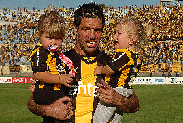 Mellizas… Antonio Pacheco se dio el gusto de ingresar a la cancha portando en brazos a sus hijas, las mellizas Catalina y Florencia. Las pequeñas aparecieron luciendo la camiseta de Peñarol con el clásico número 8.