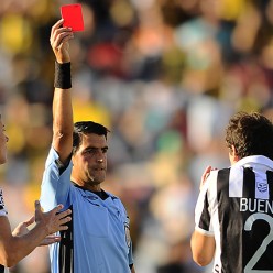 Roja… Gastón Bueno, apenas 16 minutos en cancha. El zaguero derribó a Marcelo Zalayeta en la medialuna del área defensiva bohemia y el árbitro Leodan González, aplicó el reglamento y le mostró tarjeta roja por obstaculizar el avance del adversario que se encaminaba con pelota dominada a enfrentar al último hombre, Leonardo Burián.