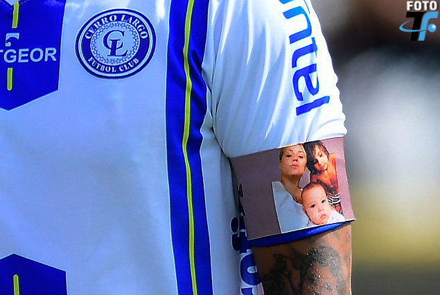 “SON MI VIDA”: Carlos Bueno, el capitán de Cerro Largo, lució el brazalete de capitán con la imagen de su esposa y sus dos hijas. La leyenda de la misma rezaba: “Son mi vida, Charly Good, 20”.