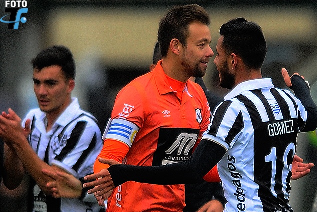 Leonardo Burián con la cinta de capitán en el festejo final junto a Mauricio Gómez.