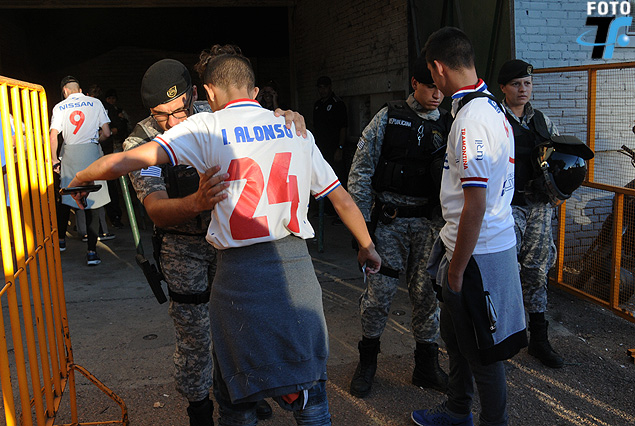 Efectivos policiales realizan cacheo personal a cada uno de los asistentes en el primer anillo de seguridad colocado delante de las distintas las puertas de acceso al Estadio Centenario. Los hinchas tras sortear la revisión policial, entrada y cédula de identidad en mano, se presentan en las distintas puertas y se habilita su ingreso a las distintas tribunas que comienzan a poblarse.