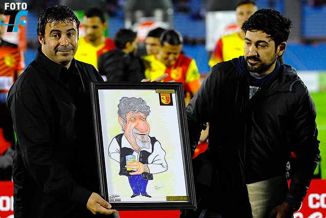 Retrato… Fabián Umpiérrez, presidente de Villa Española, en el centro del campo hizo entrega a la señora viuda de Washington Luna, una caricatura del “Canario”, hincha confeso de Villa Española. La fecha en su homenaje fue denominada con el nombre del inolvidable cantante popular.
