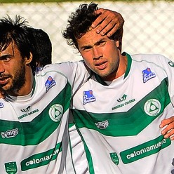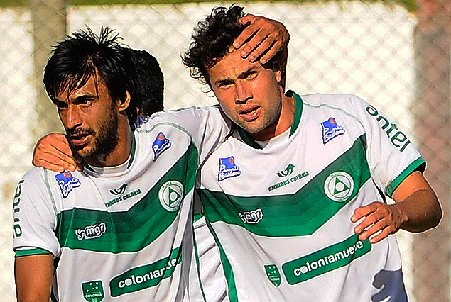 Waldemar Acosta abraza a Axel Fernández, autor de dos goles, en el triunfo de Plaza Colonia en la capital.