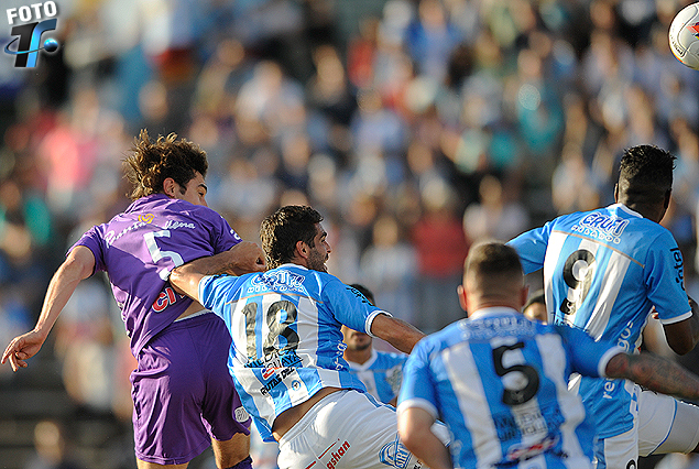 Andrés Fleurquin en las alturas, ya conectó el cabezazo ganándole a William Martínez. La pelota camino a la red.