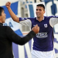 Mario Risso festeja su gol, el técnico Tabaré Silva no contiene su alegría.