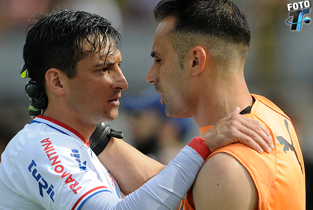 Amigos… Gonzalo Porras y Damián Frascarelli, charla entre ex darseneros. El volante tricolor y el arquero suplente aurinegro se reencontraron en la cancha previo al inicio del juego y compartieron una agradable conversación, más allá de sus actuales camisetas.