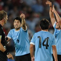 En medio de las protestas de todo el equipo oriental al juez, y cuando Chile realizaba un cambio (ingresó Matías Fernández), el árbitro le sacó la tarjeta amarilla a Luis Suárez por protestar.