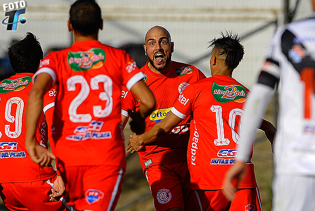 Deivis Barone en el festejo de Rentistas en el primero de los rojos que ganaron al final.