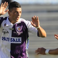 Aníbal Hernández celebra el segundo gol albivioleta, Maxi Pérez se une al festejo. Fénix sigue en la punta.