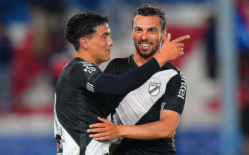 Sebastián Fernández, de inocultable pasado e identificación alba, fue clave para la victoria de Danubio. Aquí, sonríe frente a un Polenta cuya expresión habla por sí sola.